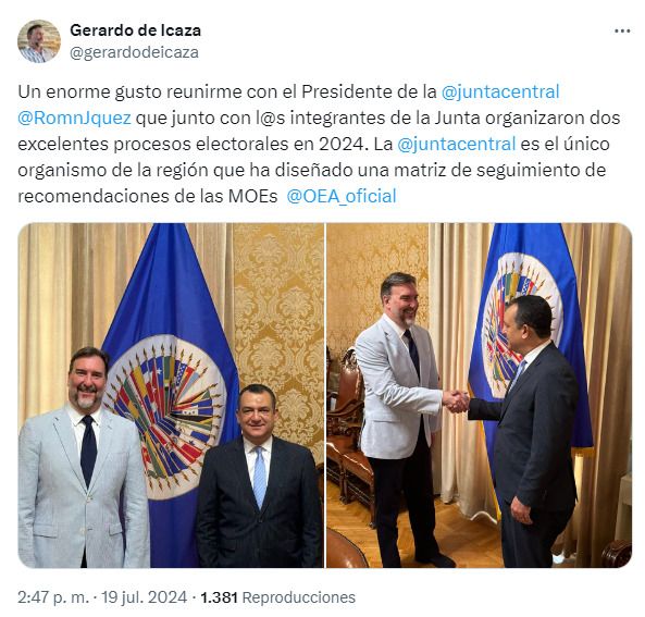 Mientras que Icaza escribió en sus redes sociales: «Un enorme gusto reunirme con el Presidente de la Junta Central, Román Jáquez, que junto a los/as integrantes de la Junta organizaron dos excelentes procesos electorales en 2024. La Junta Central es el único organismo de la región que ha diseñado una matriz de seguimiento de recomendaciones de las MOEs».