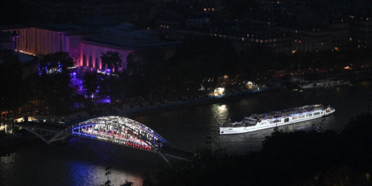 Diez minutos más tarde, a las 19:40 locales se abrió un muro de agua bajo el puente de Austerlitz, liberando el paso a esta embarcación, la primera de las 85 que transportaban a los cerca de 6,500 participantes en el desfile hasta Trocadero.